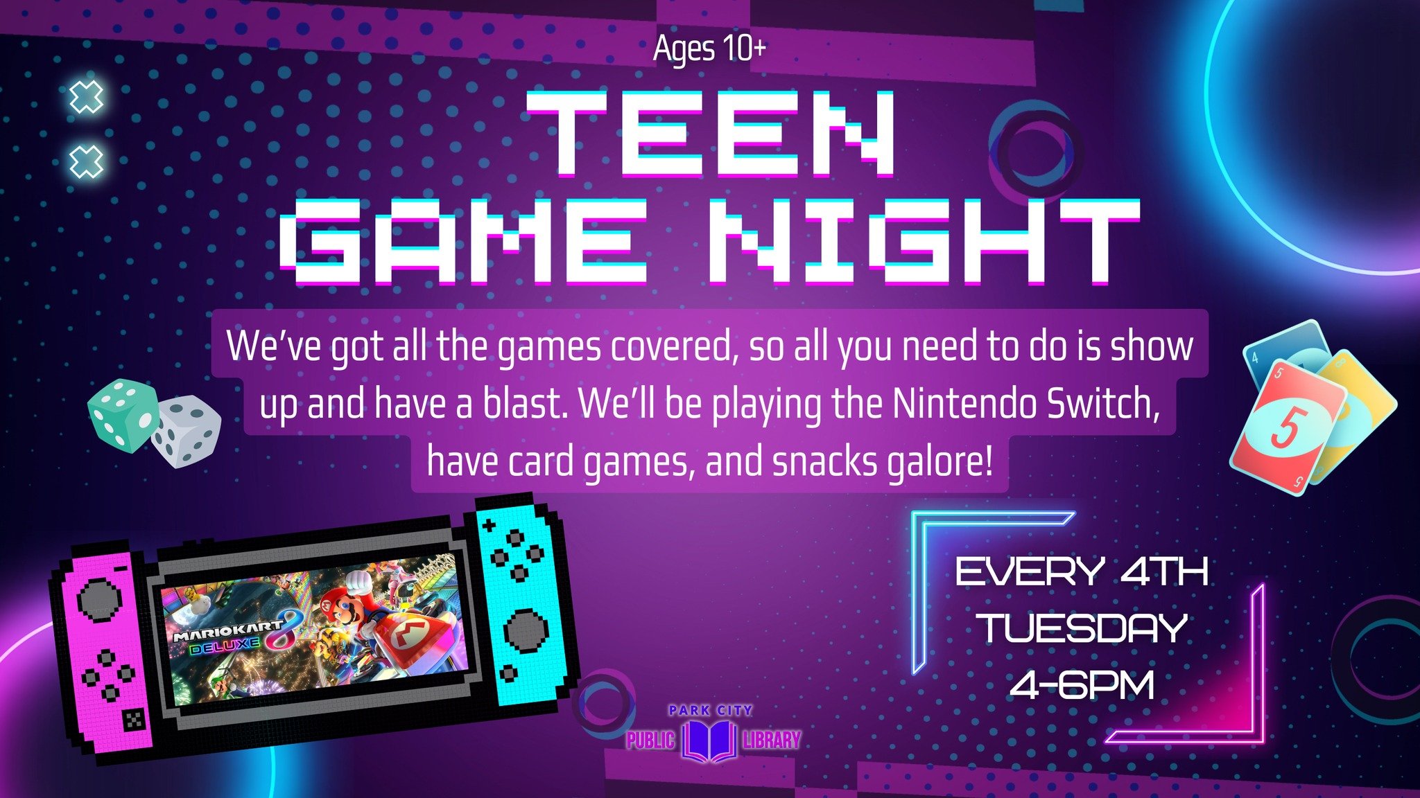 Ready for a night of epic fun? Join us at the library for Teen Game Night! Every 4th Tuesday from 4-6pm! Bring your friends, family, and all the excitement you can