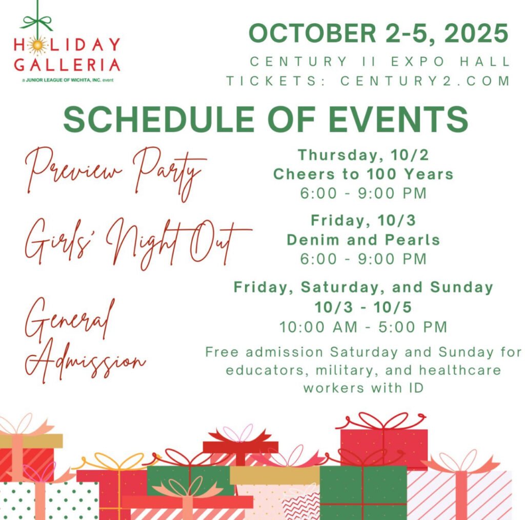 Holiday Galleria: A Day of Shopping, A Year of Giving is the Junior League of Wichita’s annual upscale shopping event featuring more than 120 regional & national merchants. The annual Holiday Galleria is scheduled for October 2-5, 2025, at Century II Expo Hall in downtown Wichita, Kansas. The objective of Holiday Galleria is to raise funds to fulfill the Junior League of Wichita’s goal of building a better community. We would like to thank the sponsors, both past & present, who helped us to raise net proceeds of more than $1.6 million in our first 18 years.