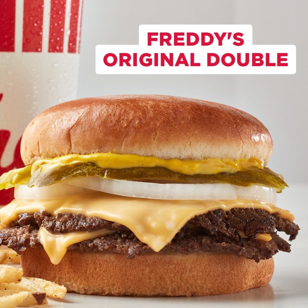 “First-time guests often ask, ‘What makes a Freddy’s steakburger special?’ Freddy’s starts with premium, lean ground beef pressed thin and seared on a flat-top grill to create deliciously crispy, caramelized edges and a juicy center. Every steakburger is cooked to order and sprinkled with Freddy’s Famous Fry Seasoning. We regularly recommend the Original Double, which comes standard with two patties, two slices of cheese, mustard, onion slices and pickle planks.” – Freddy’s Corporate