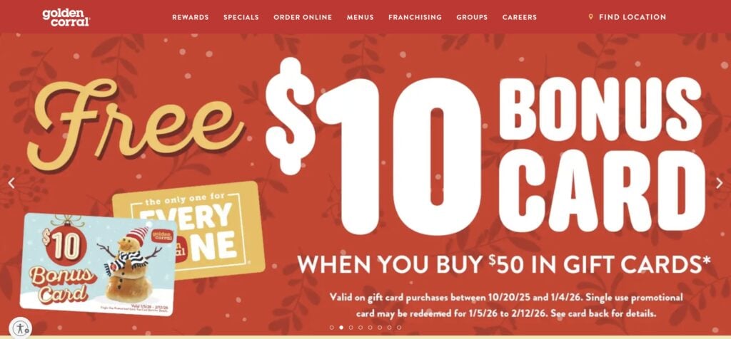 Golden Corral: Get a $10 bonus card for every $50 Golden Corral gift card purchased between 10/20/2025 and 01/04/2026. The bonus card can be redeemed from 1/5 through 2/12.