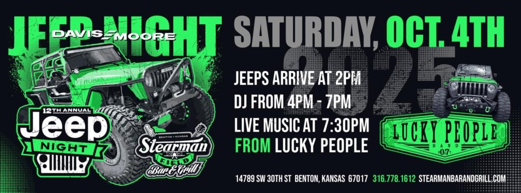 The 2025 Jeep Night is scheduled for Saturday, October 4, and Jeep enthusiasts can spend the afternoon checking out unique vehicles, enjoying food and drinks from the Bar & Grill. Now in its second decade, Jeep Night has grown into a lively gathering that brings together Wichita-area residents for a day of cars, music, and outdoor fun. Stearman Field’s unique setting makes it more than just a car show; it’s an experience where aviation and automotive culture come together.