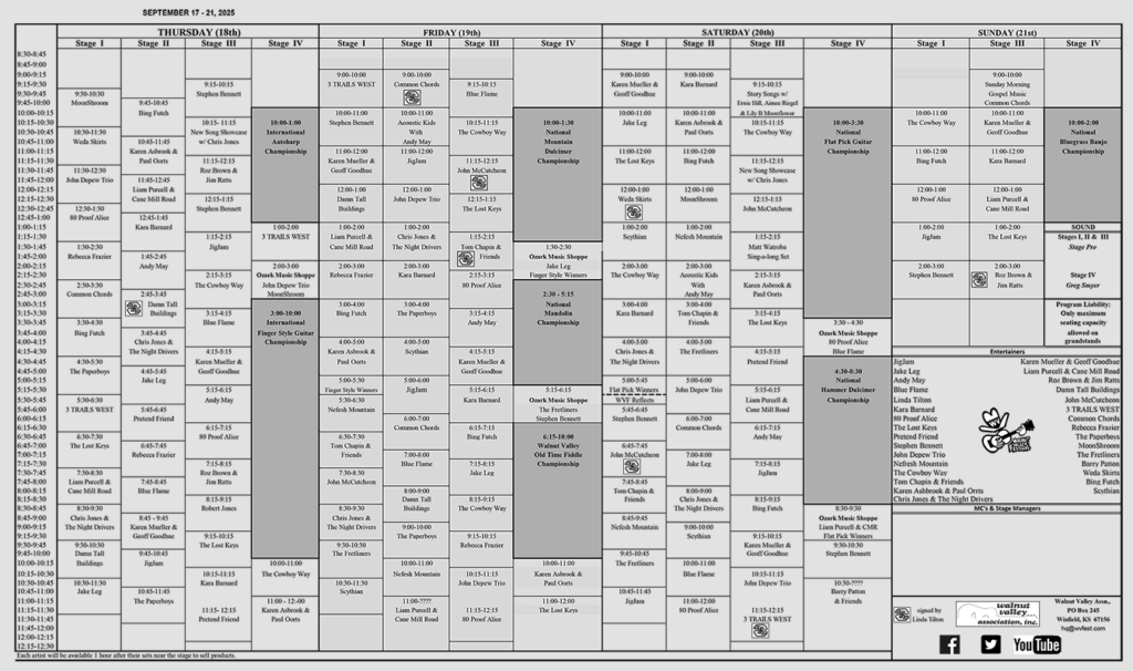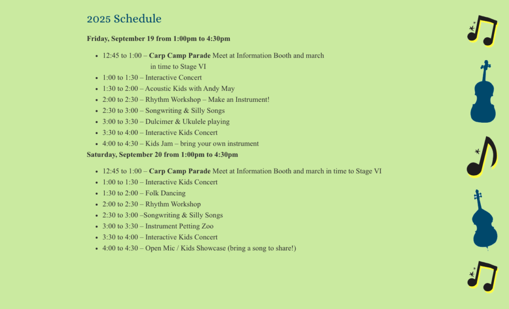 - Contests at a dedicated stage in Finger Style Guitar, Flat Pick Guitar, Bluegrass Banjo, Old Time Fiddle, Mandolin, Mountain Dulcimer, Hammer Dulcimer, and Autoharp